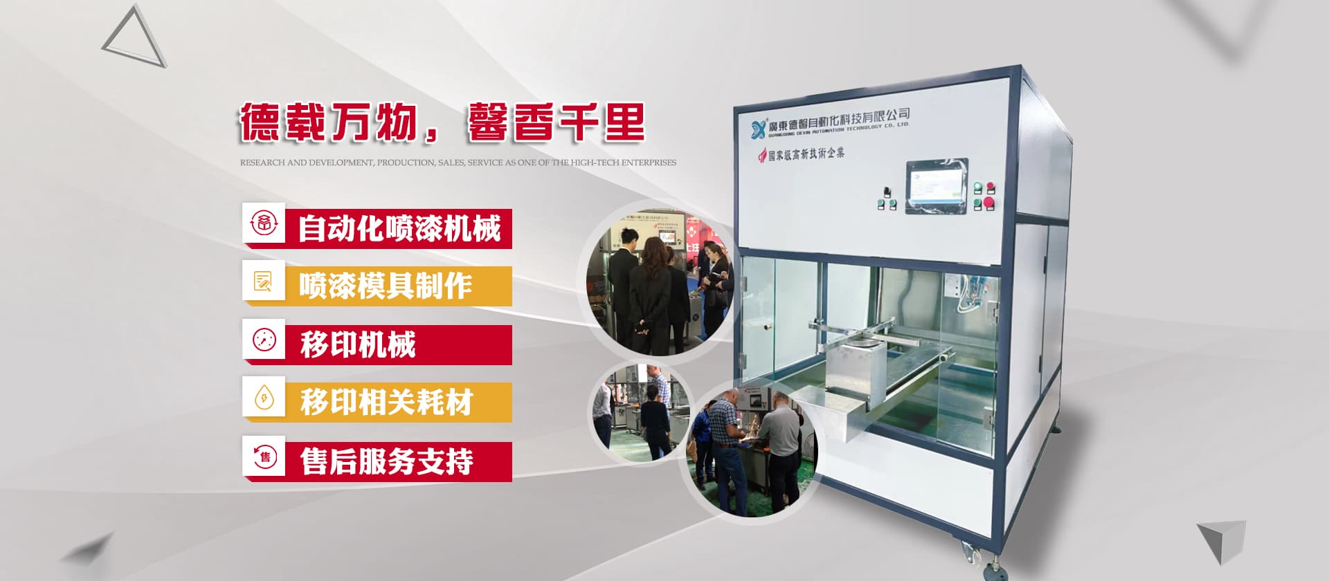 德馨科技創立以來,以改變噴印業傳統手工生產模式為目標,產品開發制造堅持以“環保、智能”為理念,為企業的生產環境、人力成本、生產效率等提供更為優良的服務和技術支持。公司研發產品主要有自動化噴漆機械、噴漆模具制作等;生產銷售移印機械及移印相關耗材,包括菲林設計輸出;鋼板制作、移印膠頭制作、定位制作及周邊配件耗材并提供完善的售后服務支持。